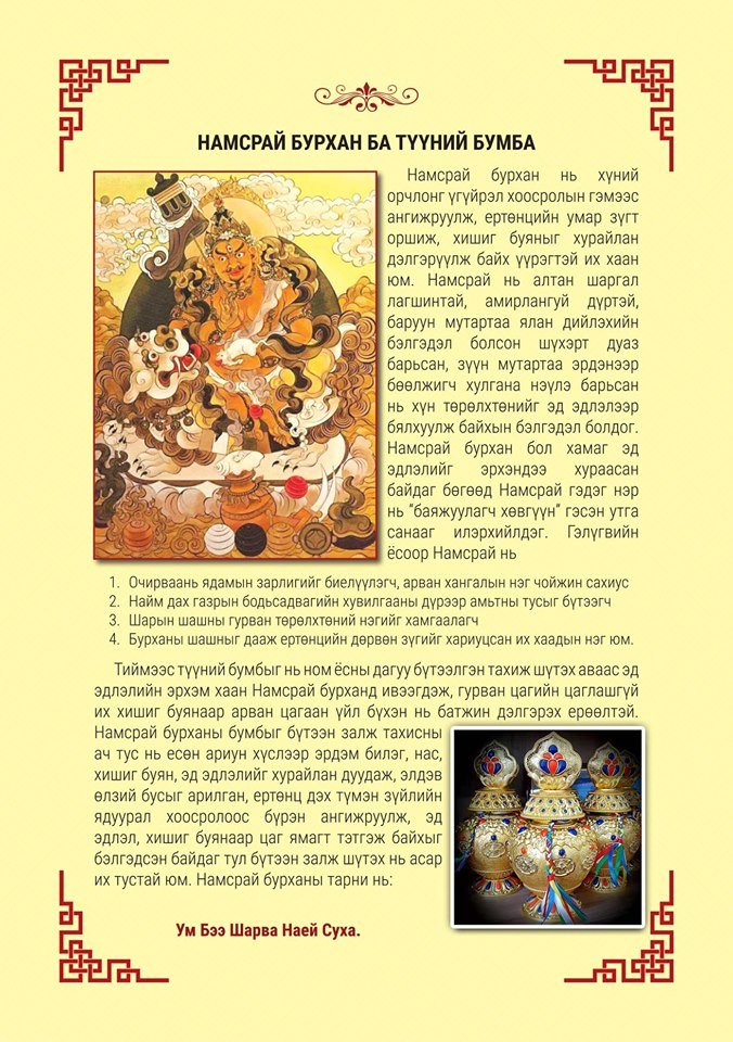 -Сайн Номуун хийдээс Бумбаны Их Тахилгыг долоо дахь жилдээ зохион байгуулах гэж байна. Жил бүрийн бумбаны тахилгаар бид нийтдээ үндсэн зургаан төрлийн бурхдын бумбыг ёсчлон тахидаг уламжлалтай. Энэ жилийн хувьд мөн ялгаагүй урьд урьдын жилд тахиж ирсэн уламжлалт ёс заншлынхаа дагуу гурван хоногийн турш тахилга үйлдэнэ.