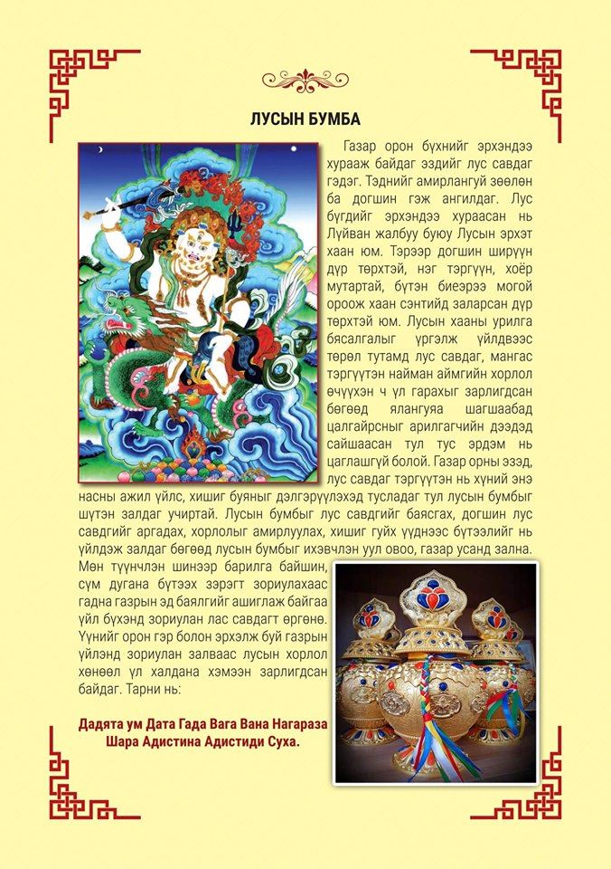 • Лусын Бумба гэж бий. Лусын эрхэт Хаан Лүйванжалбу хэмээх бурхны өмнөөс бүтээл, тахилга үйлддэг. Энэ бумбыг ихэвчлэн лус, савдаг газар орны эздэд зориулан уул, овоо, хангайд өргөх буюу газар орны эздийг баясгах, байгалийн элдэв гамшиггүй байх хийгээд догшин газар усны хорлолыг амирлуулах үүднээс гэр орондоо болон байгальд зориулан бүтээн залж тахидаг.
