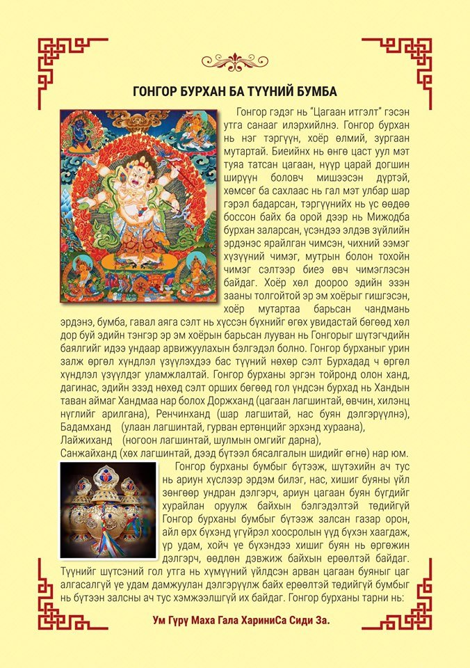 • Гонгор бурхан бол бурхны шашныг сахин хамгаалсан арван их сахиусны нэг. Гонгор бурхны бүтээлийн бумбыг ихэвчлэн арван цагаан хишиг буян зөнгөөрөө ундран дэлгэрч, хэмжээлшгүй буяны садан, сайн үйлс бүхэнтэй учирч, удам угсаа үр хойчоороо хишиг буян нь хурайлан дэлгэрч үе залгамжлагдан байхын үүднээс шүтэж тахидаг.