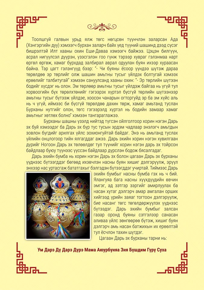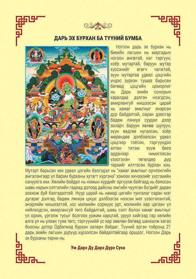 • Дарь Эхийн бумба бол ногоон, цагаан дарь эх бурхдын үүднээс бүтээдэг бумба бөгөөд үүнийг насны бумба ч гэж нэрлэдэг. Ялангуяа хүмүүний, тэр тусмаа өндөр настан, эхчүүд, эмэгтэйчүүд, хүүхэд багачуудын сайн сайхны төлөө тэдгээрийн насан хутаг батадан дэлгэрч, хишиг буян нь арвидан дэлгэрч байх үүднээс дарь эхийн бумбыг бүтээн залж тахидаг.