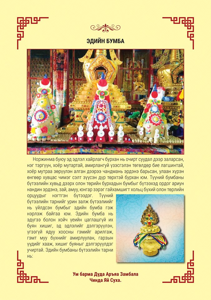 • Эдийн бумба, энэ бол Норжинмаа хэмээх бурхны өмнөөс бүтээл хийн тахидаг. Гол төлөв цаг бусийн үгүйрэл хоосролын гэм бүхнийг амирлуулж, эд баялаг, эрхэм бүхэн хурайлах үүднээс дээрх бурхдын бумбаны нэгэн адил тахиж шүтдэг. Эдгээр бурхдын бумбыг ёсчлон тахихыг бумбаны их тахилга гэж байгаа болно.