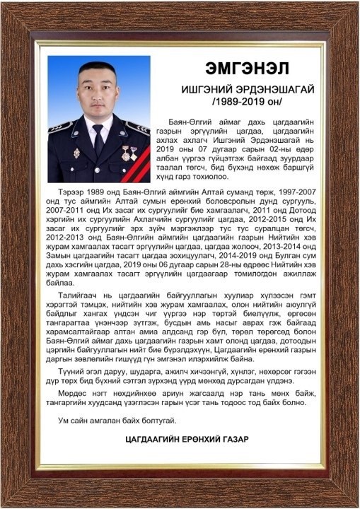 Албан үүргээ гүйцэтгэж яваад амь насаа алдсан Баян-Өлгий аймаг дахь Цагдаагийн газрын эргүүлийн цагдаа, цагдаагийн ахлах ахлагч И.Эрдэнэшагайн эхнэр, хүүхдэд орон сууцны дэмжлэг үзүүлэхээр болжээ.