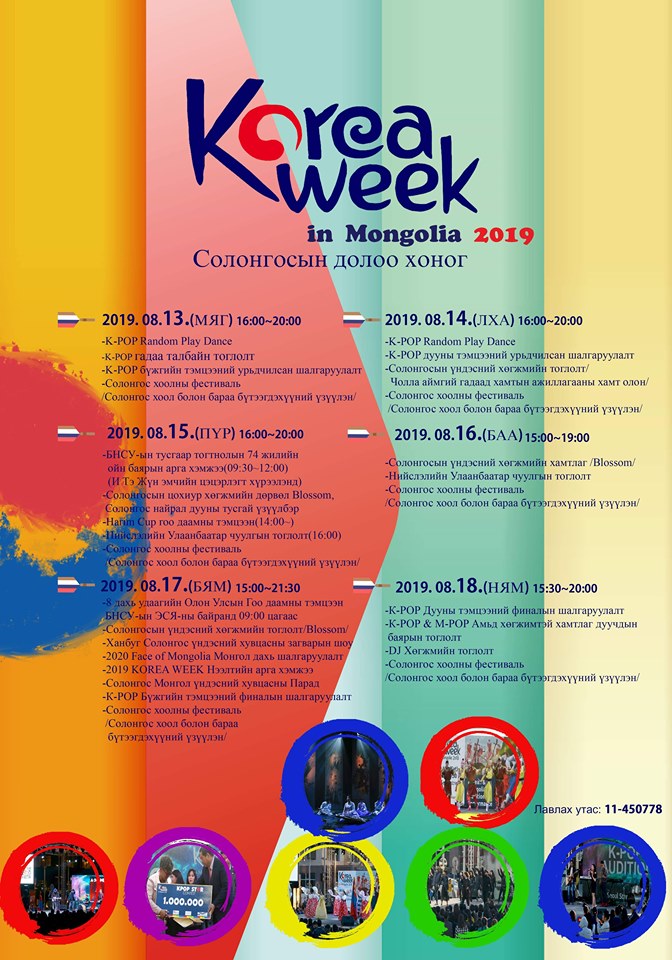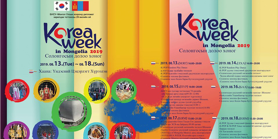 Монгол Улс, БНСУ-ын хооронд дипломат харилцаа тогтоосны 29 жилийн ой энэ онд тохиож байгаа билээ. Ойн хүрээнд нийслэлийн Засаг даргын Тамгын газар, БНСУ-ын Элчин сайдын яам хамтран “Солонгосын 7 хоног” арга хэмжээг энэ сарын 13-18-ны өдрүүдэд Үндэсний цэцэрлэгт хүрээлэнд зохион байгуулж буй. Арга хэмжээний хөтөлбөрт солонгос үндэсний хөгжмийн тоглолт, үндэсний хувцасны загварын шоу, үндэсний тоглоом, цаасан урлал, бараа бүтээгдэхүүний үзэсгэлэн худалдаа, солонгос хоолны фестиваль, Гоо даамны тэмцээн, “К-Поп” бүжгийн тэмцээн болон солонгос, монгол залуу хамтлаг дуучдын хамтарсан тоглолт, нийслэлийн “Улаанбаатар” чуулгын тоглолт багтжээ. Мөн арга хэмжээний үеэр сугалаа сугалах, вааранд сум шидэх, шаараар бүтээл урлах, нүүр будах, багаараа дээс тоглох зэрэг олон нийтэд зориулсан төрөл бүрийн сонирхолтой арга хэмжээнүүд зохион байгуулагдах аж.