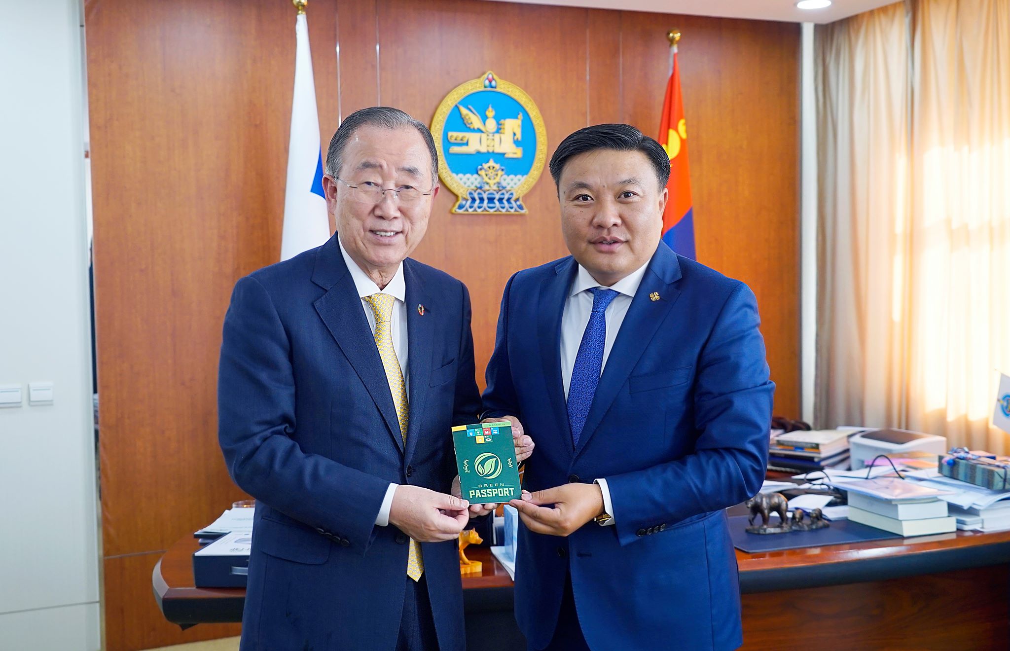 Түүнчлэн уулзалтын үеэр Байгаль орчин, аялал жуулчлалын яамны санаачлагаар хэрэгжиж буй хүүхэд залуучуудад байгаль орчныг хамгаалах, зохистой хэрэглээг дэмжих зорилготой “Ногоон паспорт” аяны явцын талаар ярилцаад БОАЖ-ын сайд Н.Цэрэнбат энэхүү санаачлагад нэгдэн ажиллахыг хүссэн бөгөөд ноён Бан Ги Мүн төслийг сайшаан ирээдүй болсон хүүхэд залуучуудыг уриалах ажлыг дэмжин ажиллахаа илэрхийллээ.