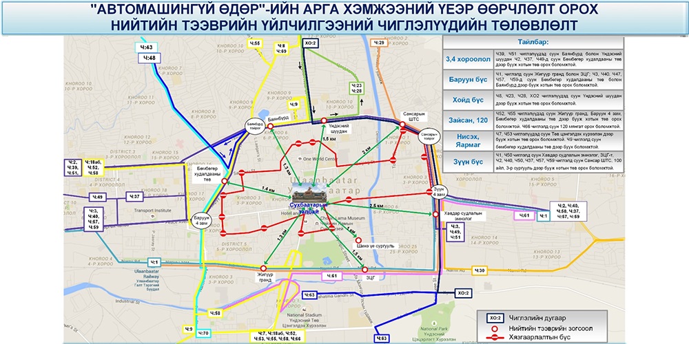 Хотын төвийн буюу Их тойруу доторх гол гудамж, замууд хаагдах үед нийтийн зорчигч тээврийн үйлчилгээний чиглэлүүд хойгуураа Их тойруугийн гудамж, урдуур Нарны зам, Намъяанжугийн гудамжаар явах бөгөөд хойноос урагш болон урдаас хойш явдаг босоо чиглэлүүд Баруун 4 зам, Нарны гүүр, Зүүн 4 замаар үйлчилж 18:00 цагаас хойш үндсэн замналаар үйлчилгээ үргэлжилнэ.