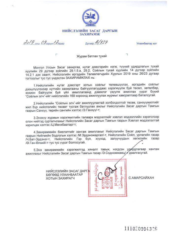 Нийслэлийн нутаг дэвсгэрт хотын соёлыг төлөвшүүлэх, иргэдийн соёлыг дээшлүүлэхээр нутгийн захиргааны байгууллагуудаас хэрэгжүүлж буй төсөл, хөтөлбөр, зохион байгуулж буй үйл ажиллагаанд дэмжлэг үзүүлэн ажиллах үүрэг бүхий Нийслэлийн 169 хороонд “Соёлын элч”-ийг ажиллуулах журам Нийслэлийн Засаг даргын 2019 оны 09 дүгээр сарын 12-ны өдрийн A/939 дугаар захирамжаар батлагдлаа.