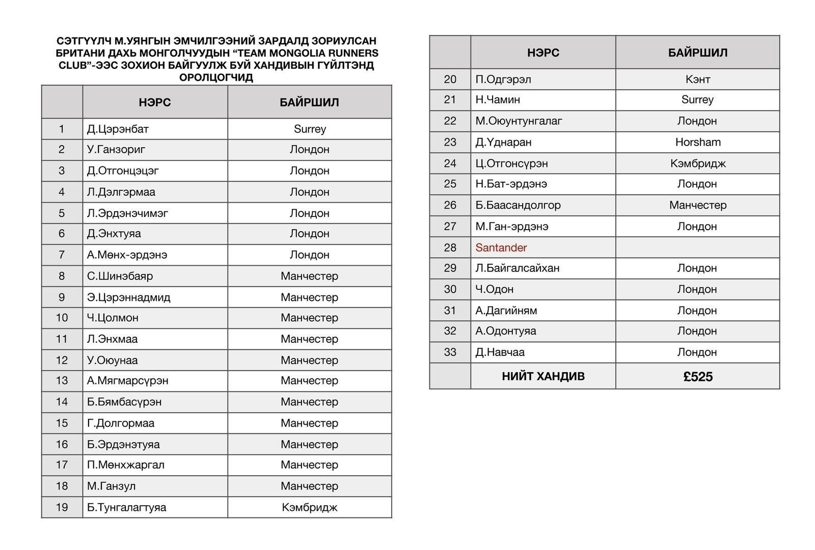 Харин энэ удаагийн хандивын гүйлт нь сэтгүүлч М.Уянгын эмчилгээний зардалд бага ч болтугай хувь нэмэр болох  үүднээс зохиогдсон бөгөөд Лондон, Манчестер,  Кембридж хотуудад амьдарч буй гүйгчид дэмжин оролцож нийт £525 фунт стерлинг буюу  ойролцоогоор 1,600,000 орчим төгрөгийн хандив цуглуулжээ. Арга хэмжээнд Монгол Улсын соёлын элч, төрийн туульч, МУСГЗ Э.Баатаржав хүрэлцэн ирж ерөөл айлдсан аж.