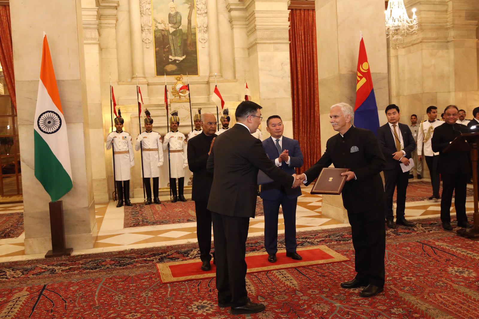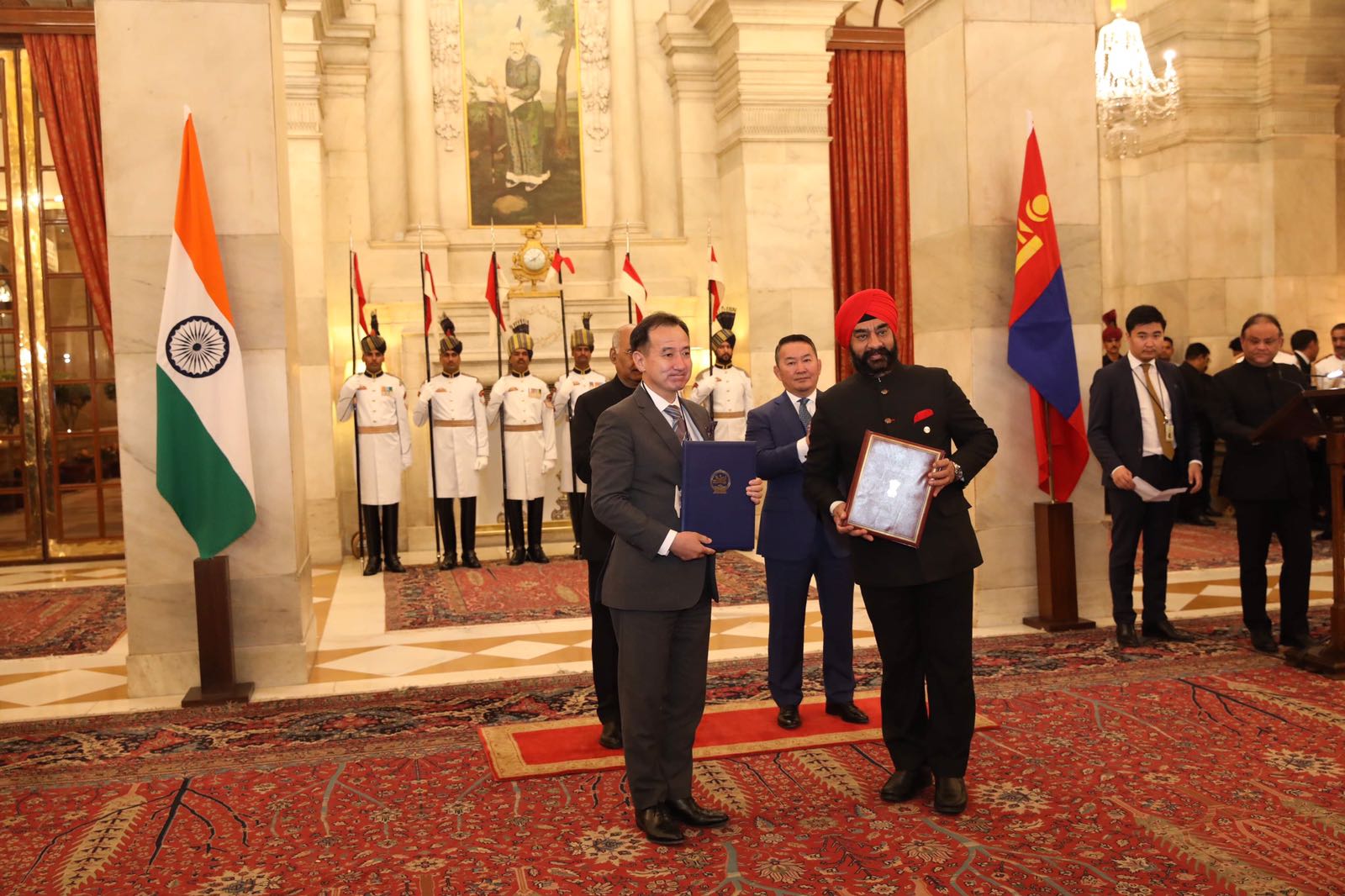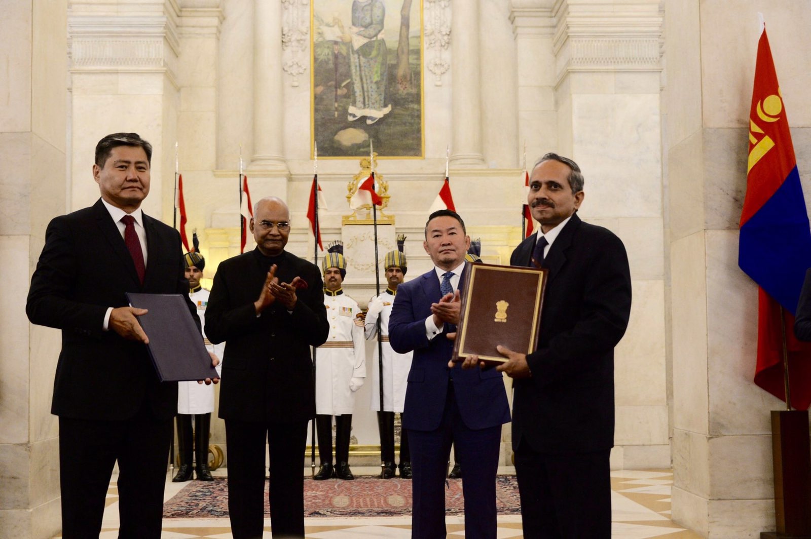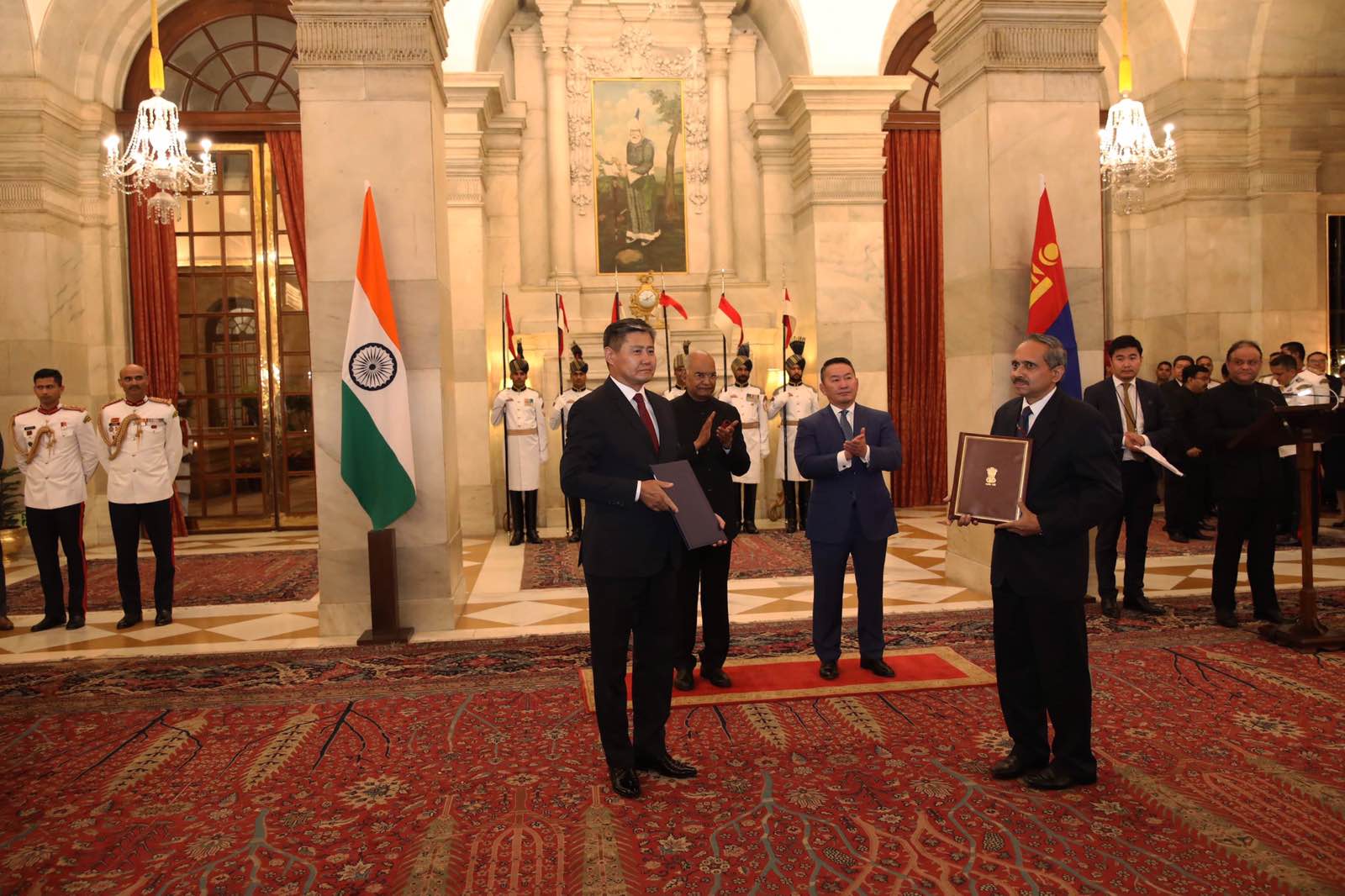 Монгол Улсын Ерөнхийлөгч Х.Баттулга, Бүгд Найрамдах Энэтхэг улсын Ерөнхийлөгч Нам Ратх Ковинд нарын уулзалтын дараа хоёр улсын Ерөнхийлөгч нарыг байлцуулан зарим баримт бичигт гарын үсэг зурах ёслол Энэтхэгийн Ерөнхийлөгчийн ордонд боллоо.