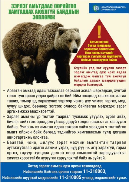 Сүүлийн үед хүрэн баавгай зэрэг зэрлэг амьтад хот суурин газарт орж ирэх тохиолдлууд нэмэгдэж байгаа тул дээрх арга хэмжээнүүдэд оролцох болон ногоон бүсэд зорчих бол аюулгүй байдлын зөвлөмжийг мөрдөж, тогтоосон зам маршрутаас өөр газраар ганцаараа зорчихгүй байхыг анхааруулж байна.