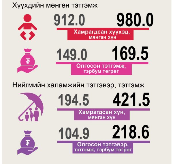 Нийгмийн халамжийн тэтгэвэр, тэтгэмж авсан хүн болон олгосон тэтгэвэр, тэтгэмжийн хэмжээ өсөхөд “0-3 хүртэлх насны хүүхэд асарсны тэтгэмж болон жирэмсэн эхийн тэтгэмж” авсан хүний тоо 3.3 дахин, олгосон тэтгэмжийн хэмжээ 8.1 дахин өссөн нь голлон нөлөөлсөн байна.