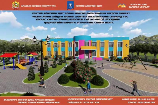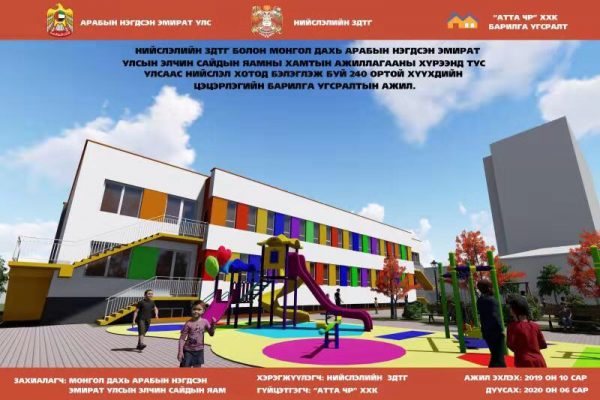 Арабын Нэгдсэн Эмират Улсын Засгийн газрын тусламжаар 240 хүүхдийн ортой Нийслэлийн Сүхбаатар дүүргийн 25 дугаар цэцэрлэг, Хэнтий, Дорноговь аймагт тус бүр 100 хүүхдийн ортой цэцэрлэгүүд шинээр баригдаж эхэллээ. Цэцэрлэгүүдийг 2020 оны 3 дугаар улиралд бүрэн ашиглалтад оруулахаар төлөвлөжээ.
