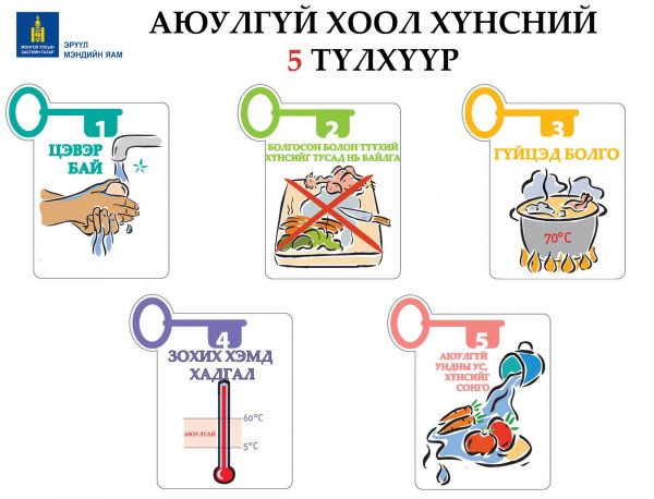 Иймд Дэлхийн эрүүл мэндийн байгууллагаас зөвлөдөг “Аюулгүй хоол, хүнсний 5 түлхүүр” буюу гараа савандаж угаах, түүхий ус уухгүй байх, хоол хүнсийг гүйцэд болгож идэх, болгосон болон түүхий хүнсийг тус тусад нь байлгах, хүнсийг зохих хэмд хадгалах зарчмыг мөрдөхийг иргэдэд зөвлөж байна.