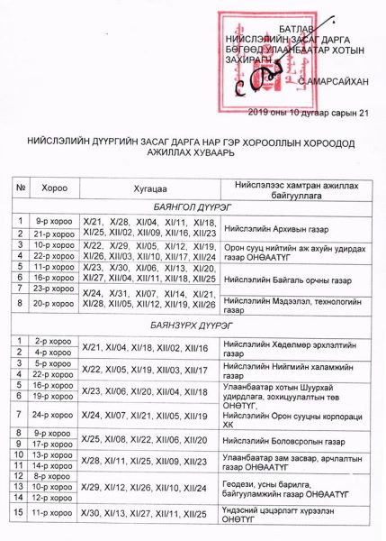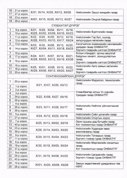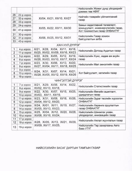 Дүүргийн Засаг дарга нар гэр хорооллын аль аль хороодод хэдний өдөр ажиллах хуваарийг танилцуулж байна.