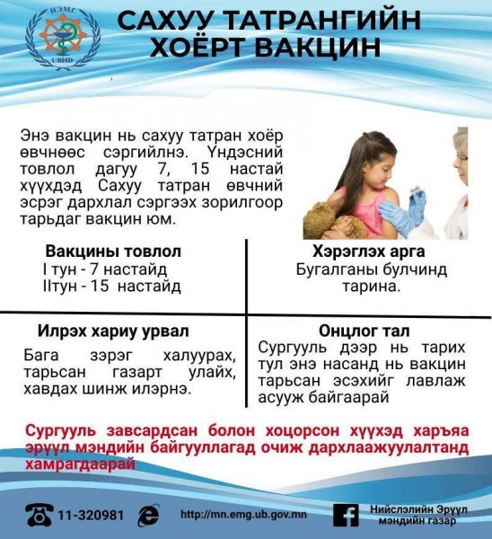 Дархлаажуулалтын үндэсний товлолын дагуу жил бүр 7, 15 настай хүүхдийг Сахуу, татран өвчний эсрэг дархлал сэргээх зорилгоор Сахуу, татрангийн хоёрт вакцинаар дархлаажуулах ажлыг зохион байгуулдаг билээ.