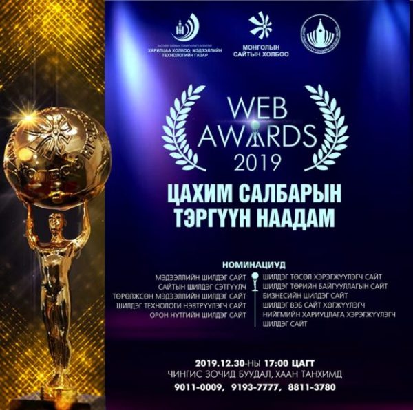 “Web awards – 2019” цахим салбарын тэргүүн наадмын хүндэтгэлийн ёслол 2019 оны 12 дугаар сарын 30 ны өдөр 17:00 цагт Чингис зочид буудлын “Хаан танхим”-д болно.