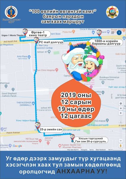 Баярын жагсаал нь 20 дугаар сургуулийн урд талбайгаас эхэлж, 25 дугаар эмийн сангийн уулзвараар Чингүнжавын гудамжаар хойшоо өгсөөд, Энэбишийн өргөн чөлөөгөөр алхаж, “Алтан төгрөг” дэлгүүрээр буцаж эргээд “Өргөө 1” кино театр дээр үйл ажиллагааны арга хэмжээ нь болох юм. Энэ өдөр түр хугацаанд замыг хэсэгчлэн хаана.