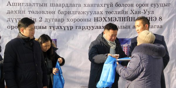 Энэ хүрээнд Хан-Уул дүүргийн 2 дугаар хорооны 19 дүгээр хороололд байрлах нэхмэлийн 1, 2, 3, 4, 5, 6, 7, 8, 9, 10, 11, 16-р байруудын газар чөлөөлөлт, орон сууцжуулалтын ажил үргэлжилж байгаа билээ. Тэгвэл хуучин гурван давхар 18 айлын орон сууцны газар дээр нэг жил найман сарын хугацаанд 16 давхар бүрэн цутгамал 187 айлын орон сууц ашиглалтад орж, өнөөдөр шинэ байрны батламж, түлхүүрийг оршин суугчдад гардууллаа.