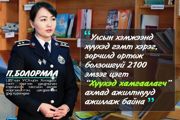 ЦЕГ-ын Урьдчилан сэргийлэх хэлтсийн Хүүхдийг гэмт хэргээс урьдчилан сэргийлэх тасгийн ахлах мэргэжилтэн, цагдаагийн дэд хурандаа П.Болормаатай “Хүүхэд хамгаалагч” төслийн хэрэгжилтийн талаар ярилцлаа.