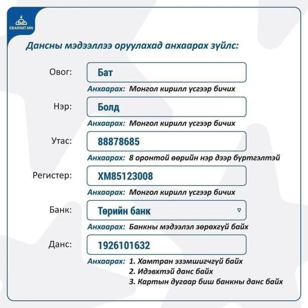 Журамд заасны дагуу албан татвар төлөгч нь төлсөн албан татварынхаа 20 хүртэлх хувийг буцаан авах хүсэлтэй бол ebarimt системд дараах мэдээллийг бүртгүүлсэн байх шаардлагатай.