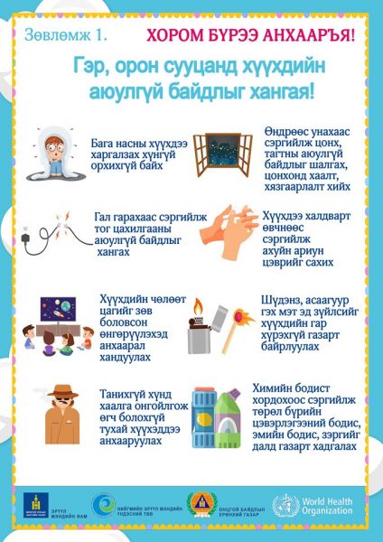 Иймд, эцэг эхчүүд гэр, орон сууцандаа хүүхэд гэмтэж бэртээх, аюул учруулж болох эрсдэлийг тооцоолж, аюулгүй орчныг бүрдүүлэх, өндрөөс унахаас сэргийлж, цонх, тагтны аюулгүй байдлыг шалгах, цонхонд хаалт, хязгаарлалт хийх, хийн түлш, химийн бодис, шатахуун зэрэг галын аюул үүсгэж болзошгүй зүйлс гэрт хадгалахгүй байх, чүдэнз, асаагуур зэргийг хүүхдийн гар хүрэхээргүй газар хадгалах хүүхдийг пийшин, зууханд хүрэхээс сэргийлэх, гал түймрийн болон угаарын аюулаас сэргийлж бага насны хүүхдийг харгалзах хүнгүйгээр гэртээ цоожилж үлдээхгүй байж, ахуйн ослоос урьдчилан сэргийлэхийг Онцгой байдлын ерөнхий газраас анхааруулж байна.
