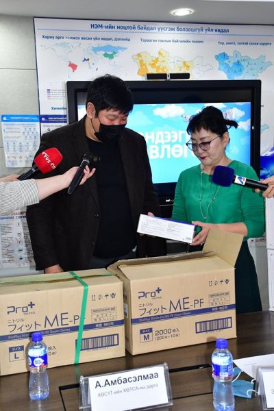 Тэгвэл Монгол Улсын гавьяат жүжигчин М.Баярмагнай Япон улсад үйлдвэрлэсэн, халдвар хамгаалалтын, нэг удаагийн 10 мянган бээлийг ЭМЯ-нд хандивлалаа.