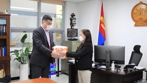 “Хилийн чанад дах Монголчуудын зөвлөл”-өөс санаачилан халдварын голомтын бүсэд байгаа монгол иргэддээ зориулан 300 ширхэг амны хаалт, мөн Бусан дахь Консулын газарт 100 ширхэг амны хаалт хандивласныг “Солонгос дах Монгол эмэгтэйчүүдийн холбоо”-ны тэргүүн П.Майнбаяр ЭСЯ-ны Консулын хэлтсийн дарга Л.Хаш-Эрдэнэд гардуулав.