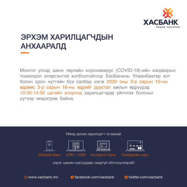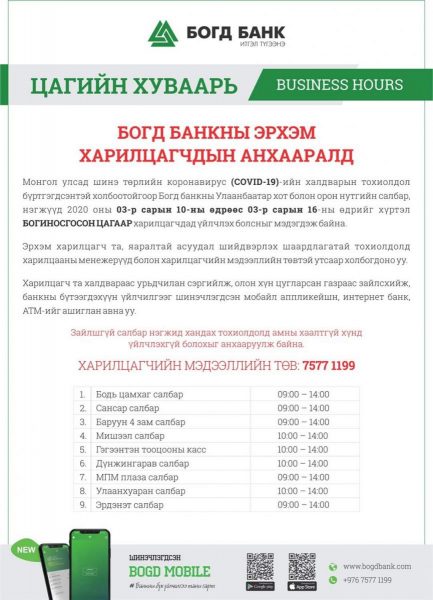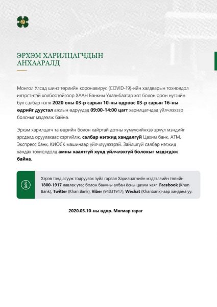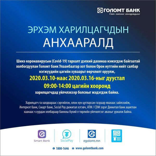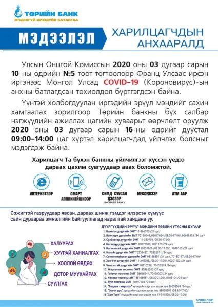Гуравдугаар сарын 02-ны өдөр Москва-Улаанбаатар чиглэлийн “Аэрофлот” компанийн онгоцоор ирсэн Бүгд Найрамдах Франц Улсын иргэнээс коронавирусийн халдвар илэрсэнтэй холбогдуулан банкууд цагийн хуваарьтаа дараах өөрчлөлтийг оруулжээ.