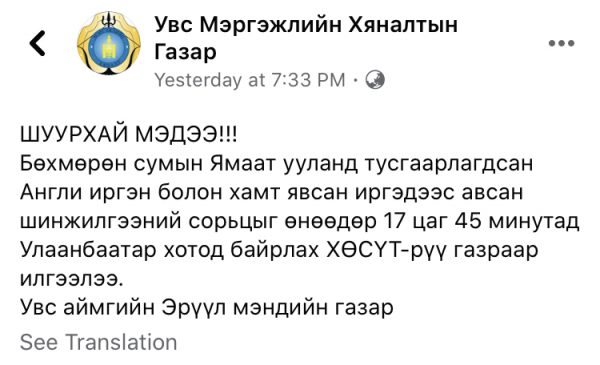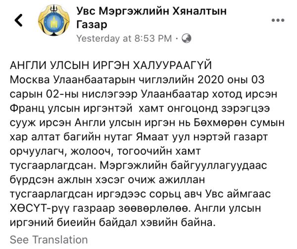 Covid19 вирусын халдвар авсан нь тогтоогдсон Франц улсын иргэнтэй Москва-Улаанбаатар чиглэлийн онгоцоор хамт зорчиж ирсэн Англи улсын иргэнийг Увс аймгийн Бөхмөрөн сумын Хар алтат багийн нутаг Ямаат уул нэртэй газар орчуулагч, тогооч, жолоочийн хамт тусгаарлаад байгаа. Тэгвэл өчигдөр мэргэжлийн байгууллагуудаас бүрдсэн ажлын хэсэг очиж ажиллан тусгаарлагдсан иргэдээс сорьц авч Увс аймгаас ХӨСҮТ-рүү газраар зөөвөрлөлөө. Тодруулбал сорьц тээвэрлэх машин өчигдөр буюу гуравдугаар сарын 11-ний 17 цаг 45 минутад Улаанбаатар хот руу гарсан байна. Одоогоор англи улсын иргэний биеийн байдал хэвийн байна гэж Увс аймгийн Мэргэжлийн хяналтын газар цахим хуудсандаа мэдээлжээ.