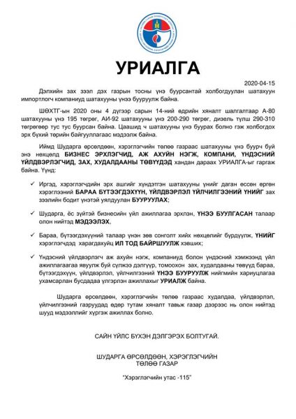 Тиймээс ШӨХТГ-аас шатахууны үнэ буурч буй энэ нөхцөлд БИЗНЕС ЭРХЛЭГЧИД, АЖ АХУЙН НЭГЖ КОМПАНИ, ҮНДЭСНИЙ ҮЙЛДВЭРЛЭГЧИД, ЗАХ, ХУДАЛДААНЫ ТӨВҮҮДЭД хандан дараах УРИАЛГА-ыг гаргажээ.