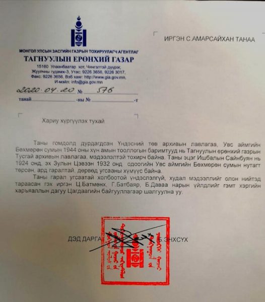 Уг албан тоотод Увс аймгийн Бөхмөрөн сумын 1944 оны хүн амын тооллогын баримт нь Тагнуулын Ерѳнхий газрын тусгай архивын баримттай таарч байгаа бөгөөд миний эцэг Ишбалын Сайнбуян нь 1924 онд, эх Зулын Цэвээн нь 1932 онд одоогийн Увс аймгийн Бөхмөрөн сумын нутагт төрсөн, дѳрвѳд угсааны малчин хүмүүс байсан гэдгийг бататгажээ.