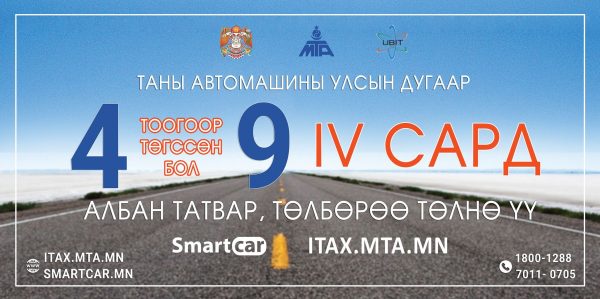 Таны тээврийн хэрэгсэлийн улсын дугаар 4 болон 9 гэсэн тоогоор төгссөн бол энэ сардаа багтаан татвар төлөх ёстой. Татвар төлөх хугацаа дуусахад нэг хоног үлдсэн тул тээврийн хэрэгсэл эзэмшигч та иргэний үүргээ биелүүлж хугацаандаа амжиж татвараа төлнө үү.