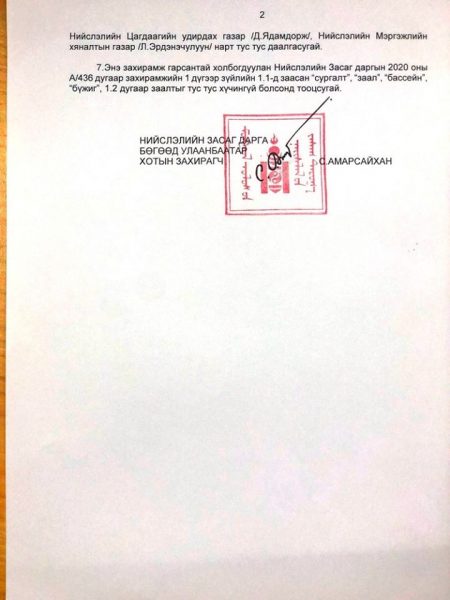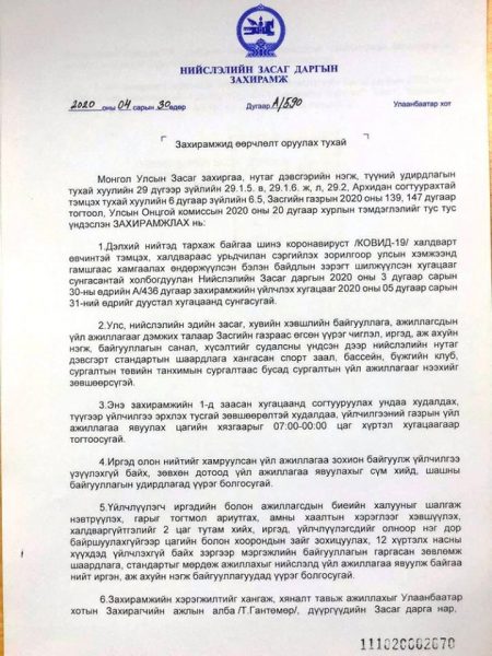 Цар тахал Covid19-ийн халдвараас урьдчилан сэргийлэх, халдвартай тэмцэх зорилгоор нийслэлийн Засаг дарга, Улаанбаатар хотын захирагч С.Амарсайхан өнгөрөгч гуравдугаар сарын 30-ны өдөр А/436 дугаар захирамж гаргасан. Тэгвэл улсын хэмжээнд гамшгаас хамгаалах өндөржүүлсэн байдлын зэрэгт шилжүүлсэн хугацааг сунгасантай холбогдуулан дээрх захирамжийн үйлчлэх хугацааг тавдугаар сарын 31-ний өдрийг хүртэл сунгах шийдвэр гаргажээ.