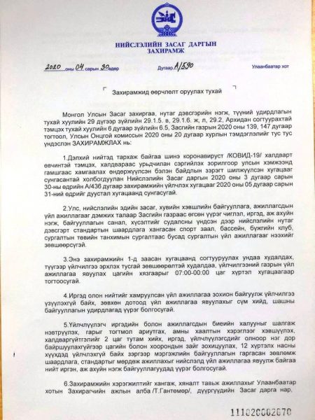 Дэлхий дахинд аюулт цар тахлын хэмжээнд хүрч 213 улс бүс нутагт дэлгэрч, 3.2 сая гаруй тохиолдол бүртгэгдэж, 230 гаруй мянган хүний амь насанд хүрсэн COVID19 буюу шинэ коронавирусын халдвараас нийслэлийн иргэд өртөхөөс урьдчилсан сэргийлэх зорилгоор өнгөрөгч 1 сараас эхлэн Улсын онцгой комисс болон Нийслэлийн Онцгой комиссоос шийдвэр гаргаж, Нийслэлийн Засаг даргын захирамжаар иргэдийн дунд хүмүүс олноороо цуглах олон нийтийн арга хэмжээг зохион байгуулахгүй байх, Их дээд сургууль, ерөнхий боловсролын сургууль цэцэрлэгийн үйл ажиллагаанд хөл хорио тогтоох, Нийслэлийн хэмжээнд бүх тѳрлийн баар, биллиард, спорт заал зэрэг спорт, соёл урлагийн газрууд, сургалтын төвүүдийн үйлчилгээг түр зогсоох шийдвэрийг 4 сарын 30-ны өдрийг хүртэл мөрдөн хэрэгжүүлэх А/436 дугаар захирамжийг өмнө нь гаргаж байсан.