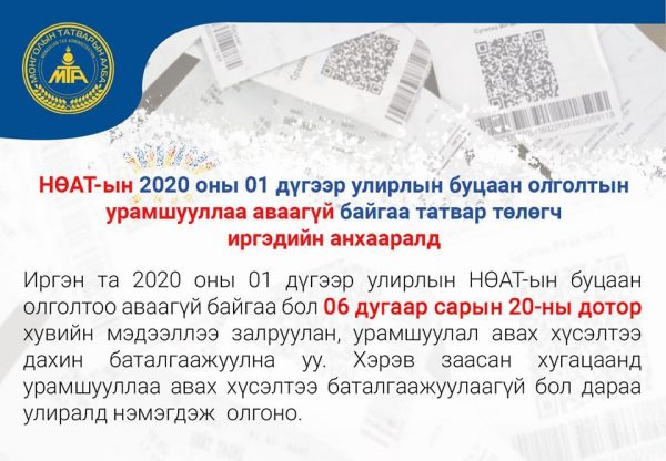 НӨАТ-ын буцаан олголтыг 2020 онд улирал бүр олгохоор болсон. Нэгдүгээр улирлын буцаан олголтыг дөрөвдүгээр сарын 20-ноос эхлэн иргэдийн данс руу шилжүүлж эхэлсэн бөгөөд зарим иргэдийн хувийн мэдээлэл зөрснөөс шалтгаалан буцаан олголтоо аваагүй байгаа ажээ.