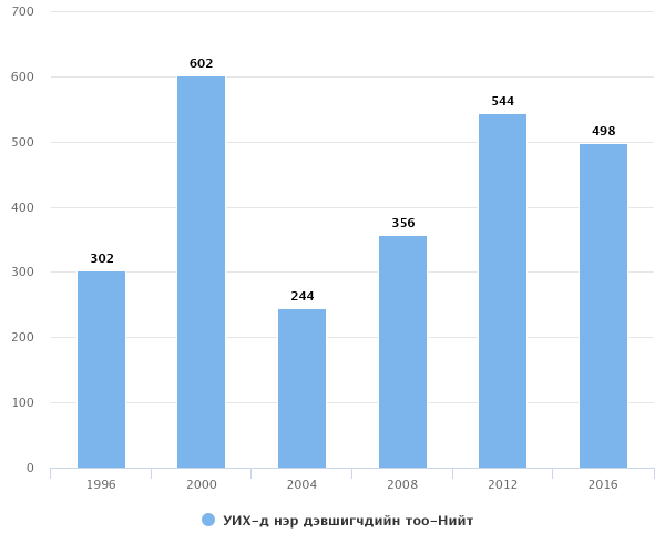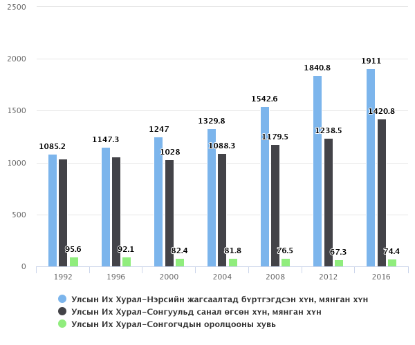 Дээрх хүснэгтээс харвал анхны УИХ сонгууль болох 1992 оны сонгуульд хамгийн өндөр буюу 95,6 хувьтай оролцож, түүнээс хойш буурсаар 2012 оны сонгуулиар сонсогчдын ирц дөнгөж 67,3 хувьтай болсон. УИХ-ын 2016 оны сонгууль 74.4 хувийн ирцтэй буюу 1.42 сая хүн санал хураалтад оролцжээ. Энэ нь 2012 оны сонгуулийнхаас 6.4 хувиар өссөн боловч 1992, 1996, 2000, 2004, 2008 онуудын сонгуулийн ирцтэй харьцуулбал буурсан үзүүлэлт байсан юм.
