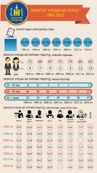 Анхны сонгууль 1992 болж түүнээс хойш нийт долоон удаагийн сонгуульд, нэг удаад 76 гишүүн сонгогдсон гэж үзэн давтагдсан тоогоор 532 УИХ-ын гишүүн сонгогдож төрийн үйл хэргийг явуулжээ.