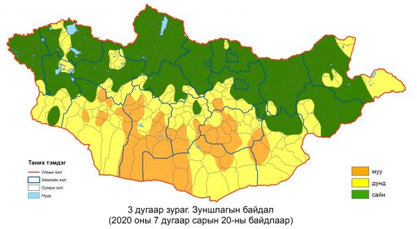 Цаг уурын байгууллагын ирүүлсэн мэдээллээр 07 дугаар сарын 20-ны өдрийн байдлаар зуншлага нийт нутгийн 50 орчим хувьд сайн, 30 гаруй хувьд дунд, 20 орчим хувьд муу үнэлгээ гарчээ.