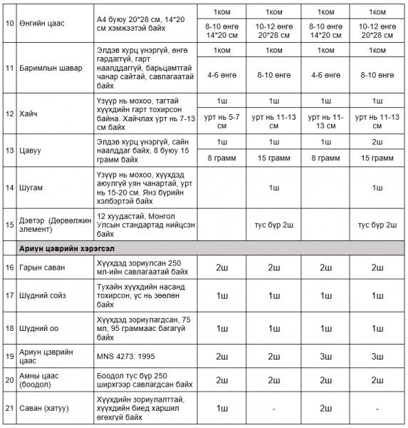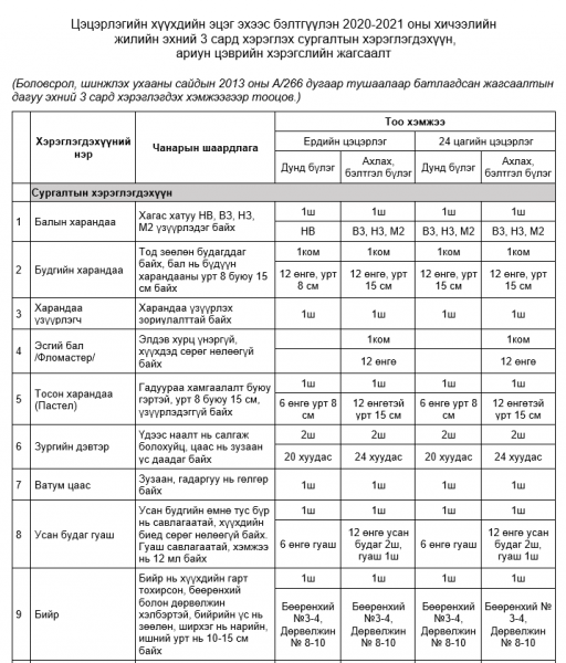 Боловсрол, шинжлэх ухааны сайдын 2020 оны “Цэцэрлэг, сургуулийн хичээл эхлүүлэх, бэлтгэл хангах, зохицуулалт хийх зарим арга хэмжээний тухай” А/17 дугаар тушаалын 2.4 дэх заалтад “Цэцэрлэгийн хүүхдийн эцэг эх, асран хамгаалагчаас хичээлийн жилд бэлтгэх сургалтын хэрэглэгдэхүүн, ариун цэврийн хэрэгслийг тэдэнд санхүүгийн дарамт үүсгэхгүйгээр авах зохицуулалт хийх” тухай заасан.