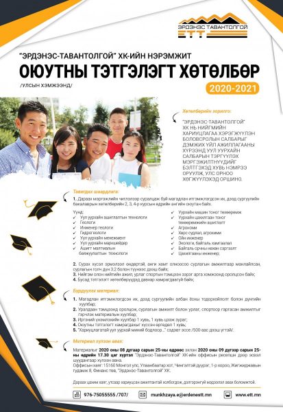 “Эрдэнэс-Тавантолгой” ХК-иас уламжлал болгон зохион байгуулдаг “Оюутны тэтгэлэгт хөтөлбөрөө /2020-2021 он/ улсын хэмжээнд зарлалаа.