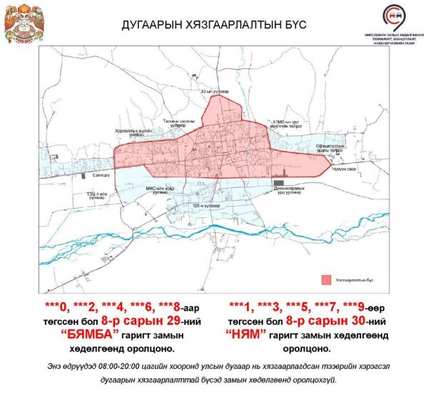 Ингэснээр улсын дугаар нь тэгш буюу 0, 2, 4, 6, 8-аар төгссөн бол наймдугаар сарын 29-ний Бямба гарагт замын хөдөлгөөнд оролцоно. Харин наймдугаар сарын 30-ны Ням гарагт сондгой тоогоор төгссөн буюу 1, 3, 5, 7, 9-өөр төгссөн улсын дугаартай автомашинууд хөдөлгөөнд оролцох юм.