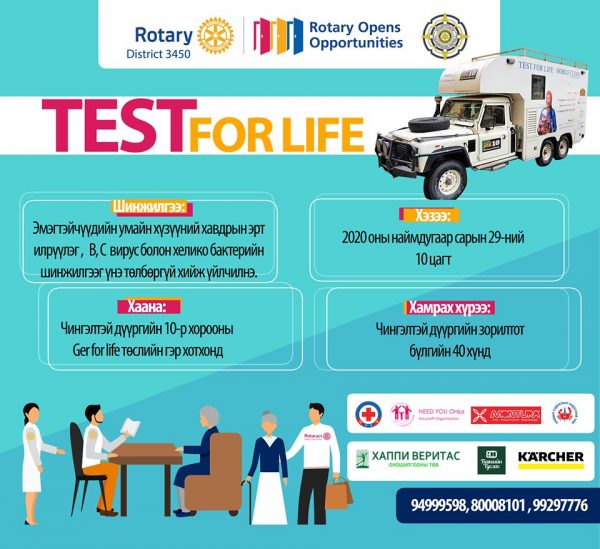 Энэхүү үйл ажиллагаагаар эмэгтэйчүүдийн умайн хүзүүний хавдрын эрт илрүүлэг, B, C вирус болон хелико бактерийн шинжилгээг хийх юм. Шинжилгээнүүдийг эмнэлгийн иж бүрэн тохижилттой автомашинд суурилагдсан хавдрын эрт илрүүлгийн явуулын эмнэлэгт авна.