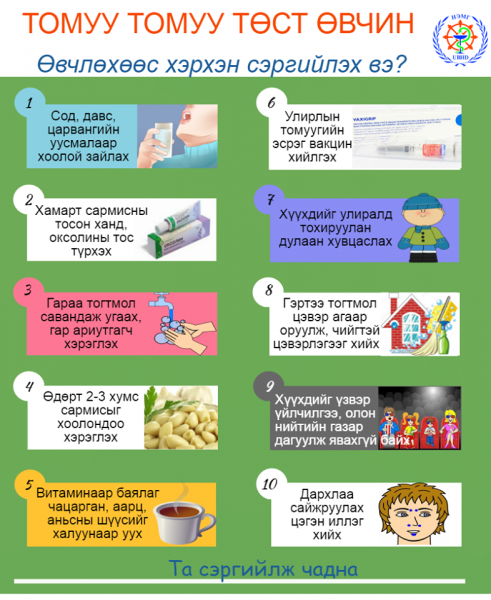 Хүйтний улиралд амьсгалын замын халдварт өвчнөөс сэргийлэх олон арга бий. Тухайлбал гэр орондоо чийгтэй цэвэрлэгээ тогтмол хийх, цэвэр агаар оруулах, гарын ариун цэврийн дэглэмийг сайтар сахих, илчлэг сайтай хоол хүнс болон витаминаар баялаг аарц, чацарганы шүүс хэрэглэх нь тун чухал юм.