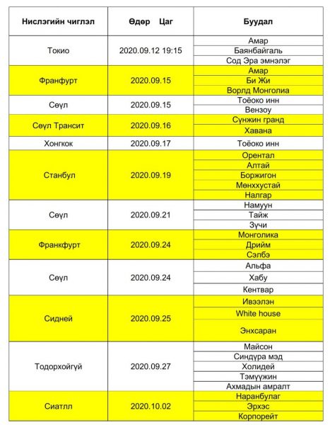 Тэгвэл УОК-ын Шуурхай штабаас дараагийн захиалгат нислэгүүдээр ирэх иргэдийг байршуулах тусгаарлан ажиглах байруудын хуваарийг гаргасныг танилцуулж байна.