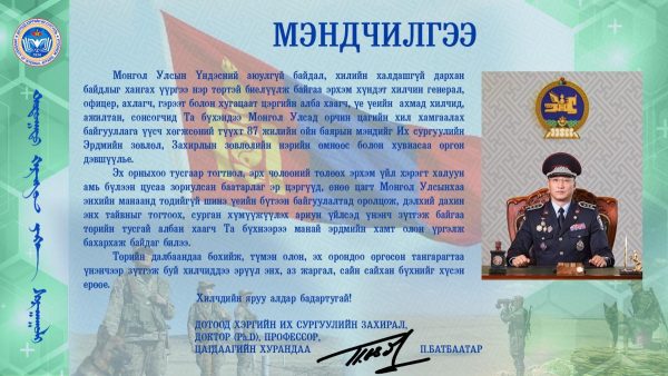 Эх орныхоо тусгаар тогтнол, эрх чөлөөний төлөөх эрхэм үйл хэрэгт халуун амь бүлээн цусаа зориулсан баатарлаг эр цэргүүд, өнөө цагт Монгол Улсынхаа энхийн манаанд төдийгүй шинэ үеийн бүтээн байгуулалтад оролцож, дэлхий дахин энх тайвныг тогтоох, сурган хүмүүжүүлэх ариун үйлсэд үнэнч зүтгэж байгаа төрийн тусгай албан хаагч Та бүхнээрээ манай эрдмийн хамт олон үргэлж бахархаж байдаг билээ.