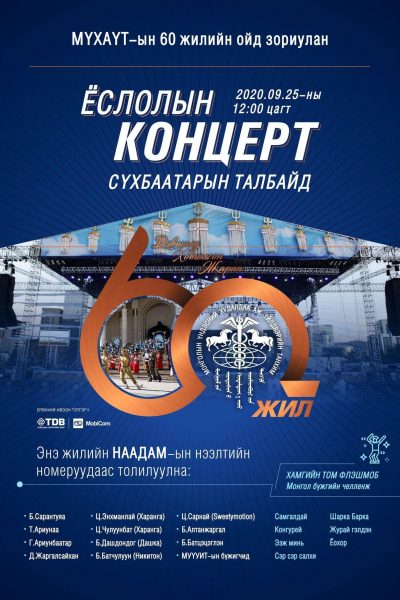 Монголын Үндэсний худалдаа аж үйлдвэрийн танхимын 60 жилийн ойд зориулсан ёслолын концерт өнөөдөр 12:00 цагт Сүхбаатарын талбайд болно.