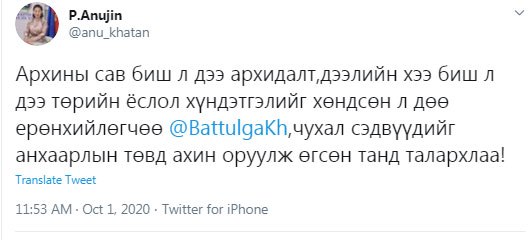 УИХ-ын гишүүн П.Анужин дээлийн хээг хуульчлах талаар байр сууриа илэрхийлж байсан тул цахим хуудаснаа “Архины сав биш л дээ архидалт, дээлхийн хээ биш л дээ төрийн ёслол хүндэтгэлийг хөндсөн л дөө. Ерөнхийлөгч өө, чухал сэдвүүдийг анхаарлын төвд ахин оруулж өгсөнд танд талархлаа” хэмээн өөрийгөө өмөөрчээ. Энэ мэтчлэн УИХ-ын гишүүд ижий аавдаа эрхэлж байгаа шиг авир гаргавал хэцүү л юм болж дээ.