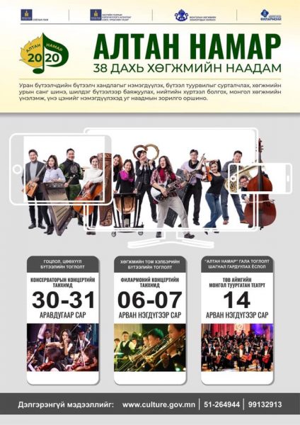 Монгол Улсын Соёлын Яам, ЗГХА Соёл, урлагийн газар, Монголын Хөгжмийн Зохиолчдын Холбоо хамтран 2020 оны 10 дугаар сарын 05-ны өдрөөс 11 дүгээр сарын 15-ны өдрийг хүртэлх хугацаанд “БҮХ НИЙТИЙН ХӨГЖМИЙН БАЯР 2020” нэгдсэн арга хэмжээг улсын хэмжээнд зохион байгуулж буй бөгөөд уг арга хэмжээний хүрээнд жил бүр уламжлал болгон зохион явагддаг “Алтан намар” хөгжмийн наадам энэ жил 38 дахь удаагаа зохион байгуулагдах гэж байна.