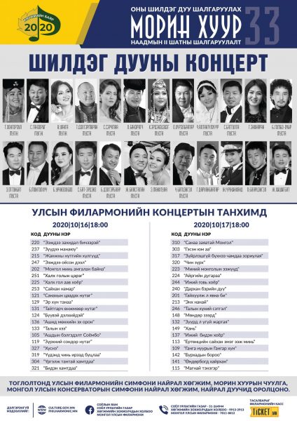 “Морин хуур” 33 дахь удаагийн наадмын хоёрдугаар шатанд шалгарсан дууны уран бүтээлийн концерт энэ сарын 16,17-ны өдрүүдэд Улсын Филармонийн Концертын танхимд үзэгчидтэйгээр зохион явагдах гэж байна.