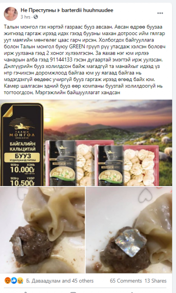 Грийн Фактори ХХК-ын Талын монгол буузнаас мөнгөлөг цаас гарч иржээ. Тодруулбал, Энэ сарын 17 нд Далайхүү худалдааны захаас иргэн О нь талын монгол байгалийн кальцитай бууз худалдаж авсан. Уг бүтээгдэхүүнээс зөрчил илэрсэн тухай сошиалд гомдолоо илэрхийлжээ.