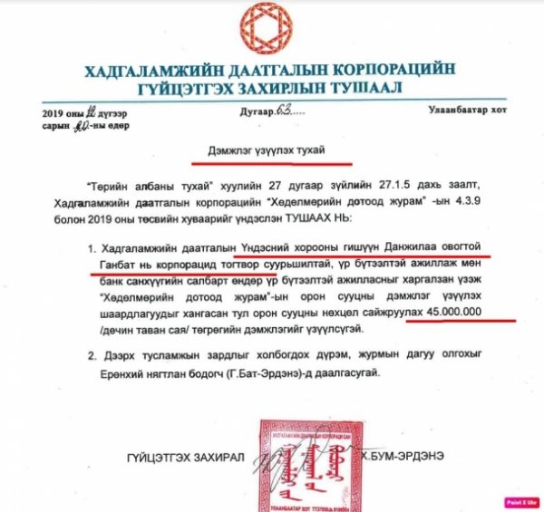 Тэгвэл Шилэн Цогоо дахин нэг ноцтой баримт дэлгэлээ. Тодруулбал, “Х.Бум-Эрдэнэ нь Монголбанкны Ахлах хянан шалгагч Д.Ганбатад 45 сая төгрөгийн орон сууцны дэмжлэг үзүүлжээ. Хянан шалгадаг байгууллагын Ахлах шалгагч нь мөнгө авсан тул шалгахгүй байх нь аргагүй юм” хэмээгээд баримтыг хавсаргасан байна. Уг баримтыг хүргэж байна.
